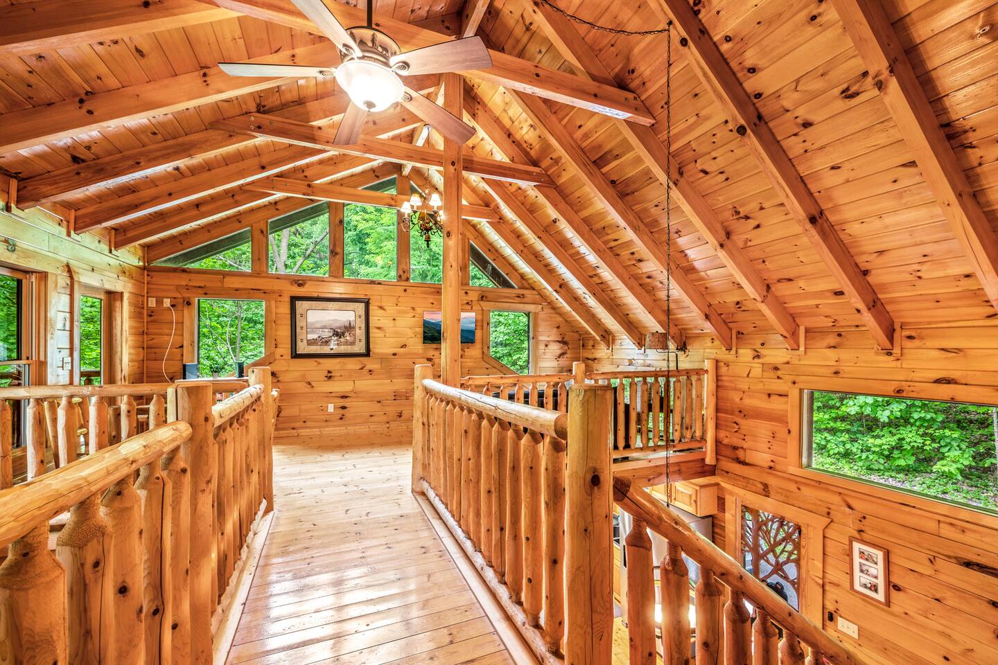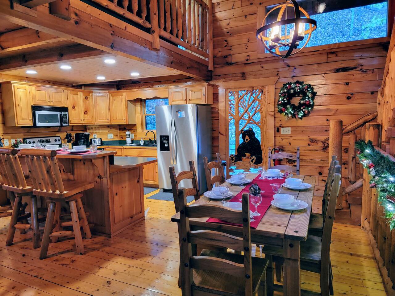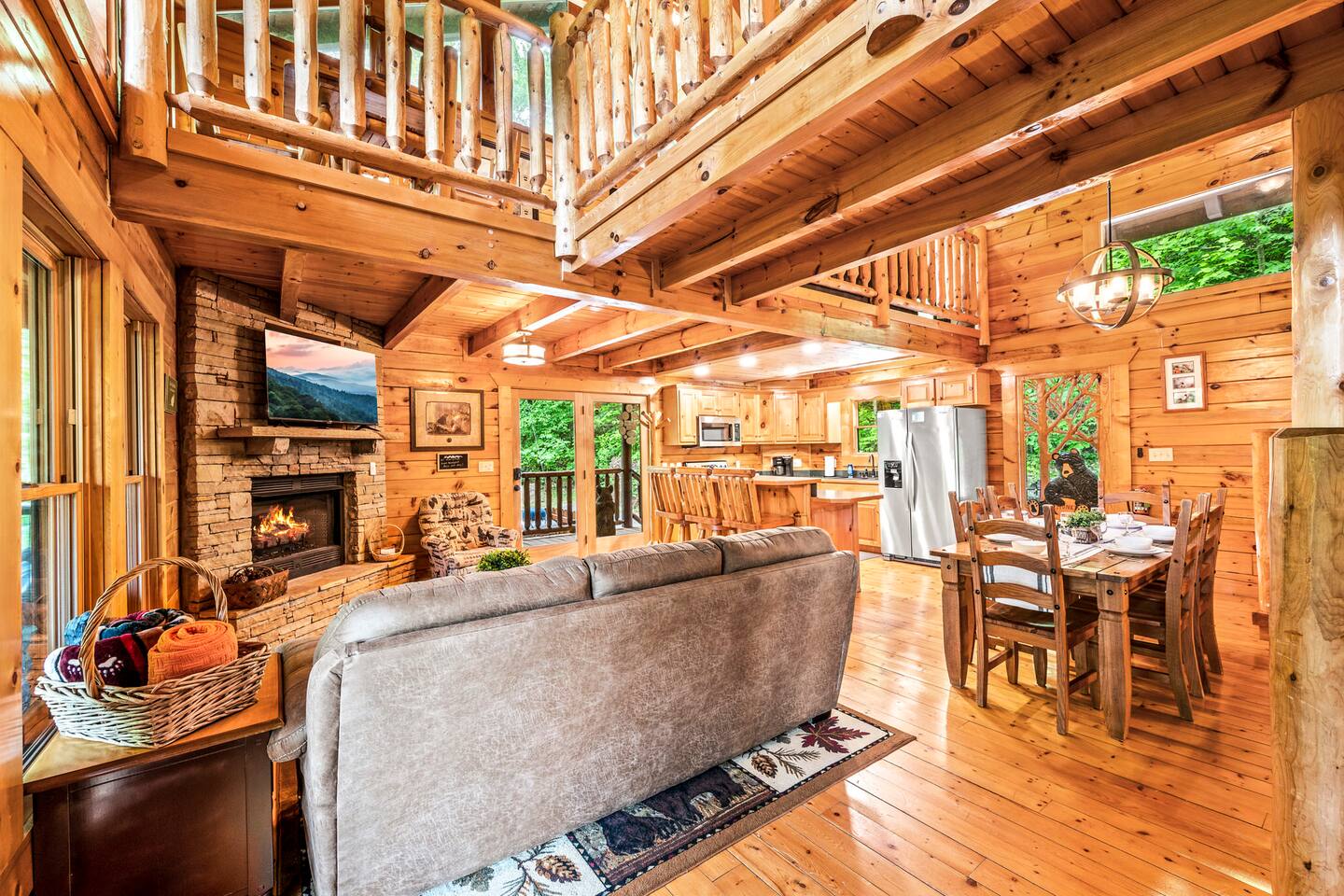 Imagine a charming log cabin, tucked into the woods but only 3 minutes to town. With regular bear visits too! Whispering Canyon includes: -Comfortable accommodations for up to 12 guests - Approx. 2500 square feet of indoor space -3 Private Bedrooms with full private bathrooms -3 Decks that each run the full length of the cabin -3 Living areas with comfortable seating -High Speed Wi-Fi and smart TV's -Pool table & Arcade Games in the rec room -Reading nook and board game table in the loft -Hot tub on lower deck -Propane Firepit on deck - Tons of Outdoor Seating -Fully equipped kitchen and dining space -Gas BBQ grill - No smoking, No animals allowed Whispering Canyon, located off Ski Mountain Rd in Gatlinburg, is the ideal traditional log cabin perfect for gatherings of friends and family. Situated at the top of over an acre of forested land, the cabin boasts three separate living spaces, ensuring there is space for everyone to spread out. Large open spaces also make it easy to all gather together. All 3 decks come with multiple rocking chairs and cushioned seating to unwind and enjoy your morning cup of coffee or your evening glass of wine (or 'shine). The hot tub is bubbling and inviting. The pool table is ready for friendly competition. The kitchen is fully stocked with everything you need to prepare any meal. Roku enabled Smart TVs allow you to access your own streaming subscriptions from every room throughout the cabin. When you are ready, Gatlinburg, Pigeon Forge, Great Smoky Mountains National Park, Dollywood, and all local attractions are just a few minutes away. Whispering Canyon is located: -1.1 Mile to the Parkway in Gatlinburg -1.3 Miles to the Main Entrance to GSMNP -1.9 Miles to Anakeesta -2.0 Miles to Ober Mountain -7.5 Miles to Pigeon Forge -10 Miles to Dollywood Main Level -Great room with living room, fully equipped kitchen, dining room with seating for 11, King bedroom and full bathroom with jetted tub and separate shower. Access the full length deck with gas BBQ and patio table from the living room and the bedroom. Upper Level - King bedroom with full bathroom, catwalk to the loft with comfortable seating, Smart TV, board game table and Queen sleeper sofa. This is a perfect quiet spot for reading, playing a game, or getting some work done. The full length deck can be accessed by both the loft and the bedroom. Lower Level - A large multi-use recreation room with sectional sofa in front of a 65 inch Smart TV, a pool table, arcade games, and pub table w/ stools. The 3rd bedroom is next to the rec room, with a twin over full bunk bed, and full over full bunkbed. The attached full bathroom has a tub/shower combo. Access to the deck with hot tub is found in the bedroom and rec room. A half bath and laundry room with stacked washer and dryer are downstairs as well. Whispering Canyon has good cell strength and free strong wi-fi. All TVs are streaming capable, allowing you to log in to all your favorite streaming apps.