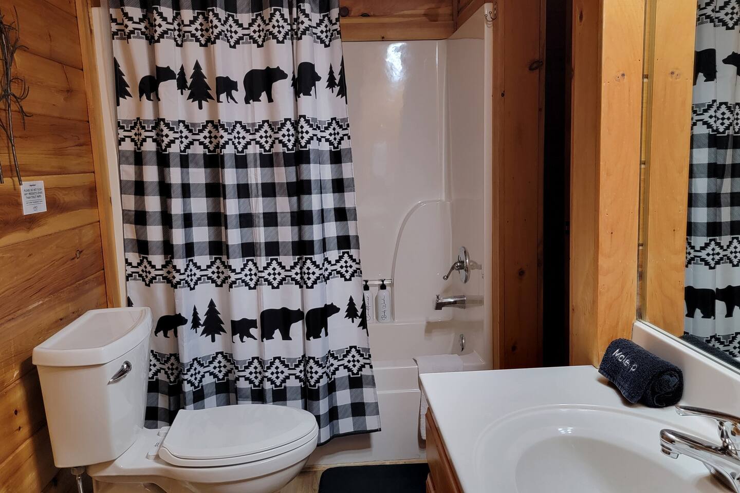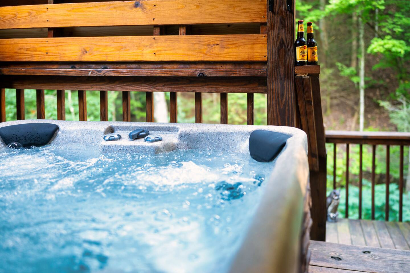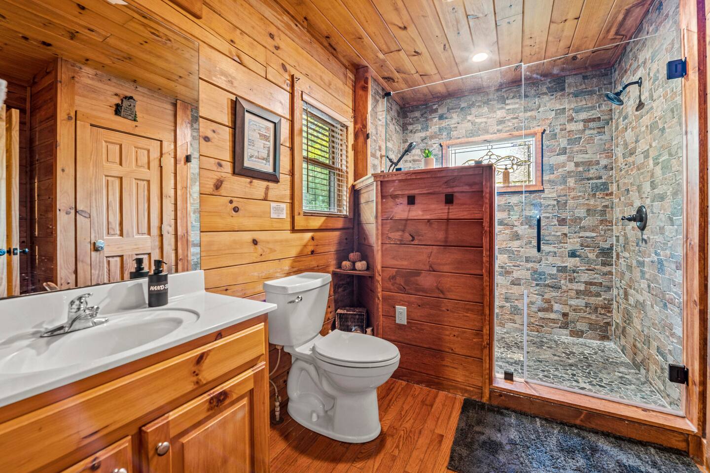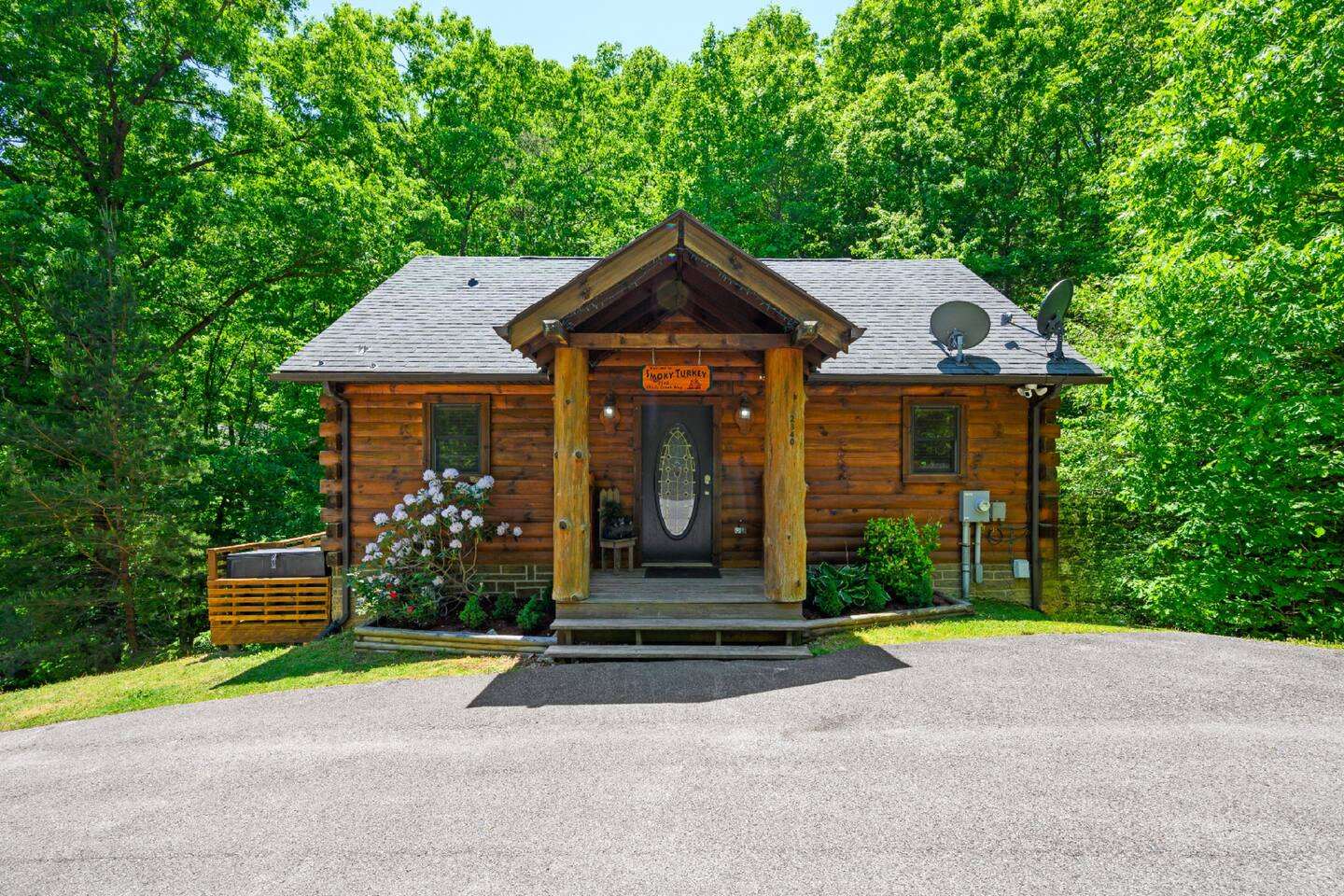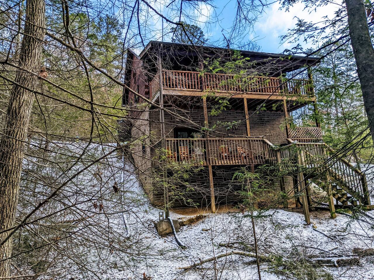This is the perfect cabin for couples, friends, or smaller families looking to come together and create lasting memories. The cabin is divided between two levels, each floor with a private bedroom with King bed and full bathroom. Check out the photos of the new double walk in shower! Upstairs, besides a King bedroom with direct deck access, you will also find a living room with leather couches, sleeper sofa, large screen smart TV with Roku and DVD player, and a fully equipped kitchen. The gas fireplace, with push button starter, is available Oct-April. Downstairs is another private bedroom with King bed and full bathroom. The rec room is downstairs with a pool table, arcade games, TV, board games and books, and a queen sleeper sofa. The hot tub is right outside on the bottom deck. Both decks offer a beautiful wooded setting to enjoy your morning cup of coffee and your evening glass of wine (or shine). Continue down the back stairs to the yard overlooking the seasonal creek with a wood burning firepit. This is the perfect spot to roast marshmallows and enjoy the clear mountain air. When you are ready to venture out, you will find all Smoky Mountain attractions and amusements are only minutes away. We are in the Wears Valley area, right between the Great Smoky Mountains National Park and Pigeon Forge. Whether you are into hiking, biking, horseback riding, and rafting; or more into Dollywood, mountain coasters, dinner shows, and go carts, fun for all is close at hand! Smoky Turkey is a traditional cabin in the woods. This means you may see different critters including turkeys and bears . We advise you keep doors shut so these critters don't find their way inside. Also always lock your car and bring all food indoors. Be sure all trash always makes its way into the bear proof trash bins. Also, because we are in the woods, Smoky Turkey has spotty cell reception but offers high speed Starlink satellite internet. Simply log on to the wifi for all internet activity. All televisions have DVD players too, with a collection of modern and classic movies. We do not allow pets. We do not allow smoking or vaping inside or on any deck space.