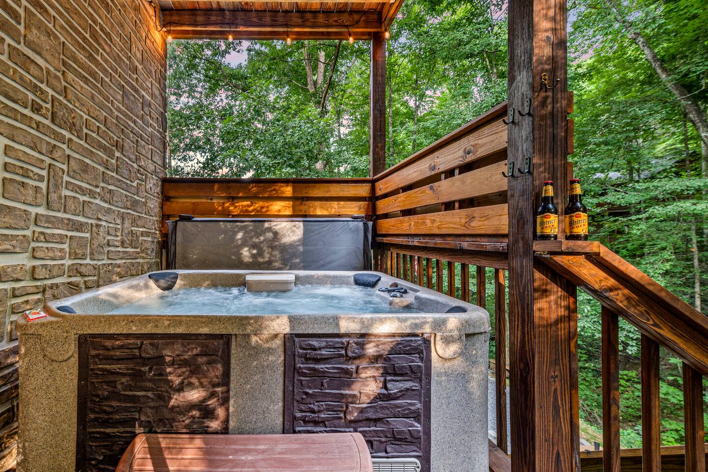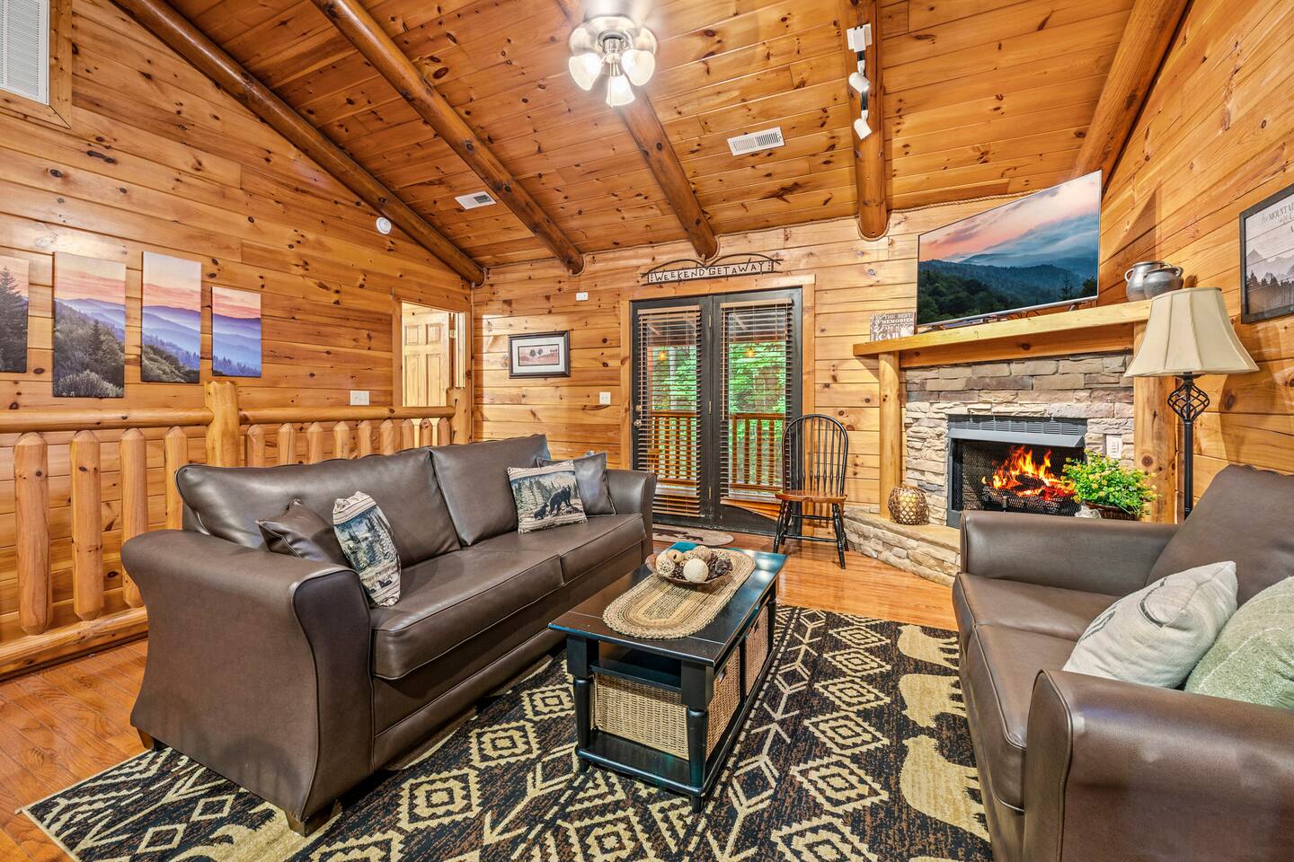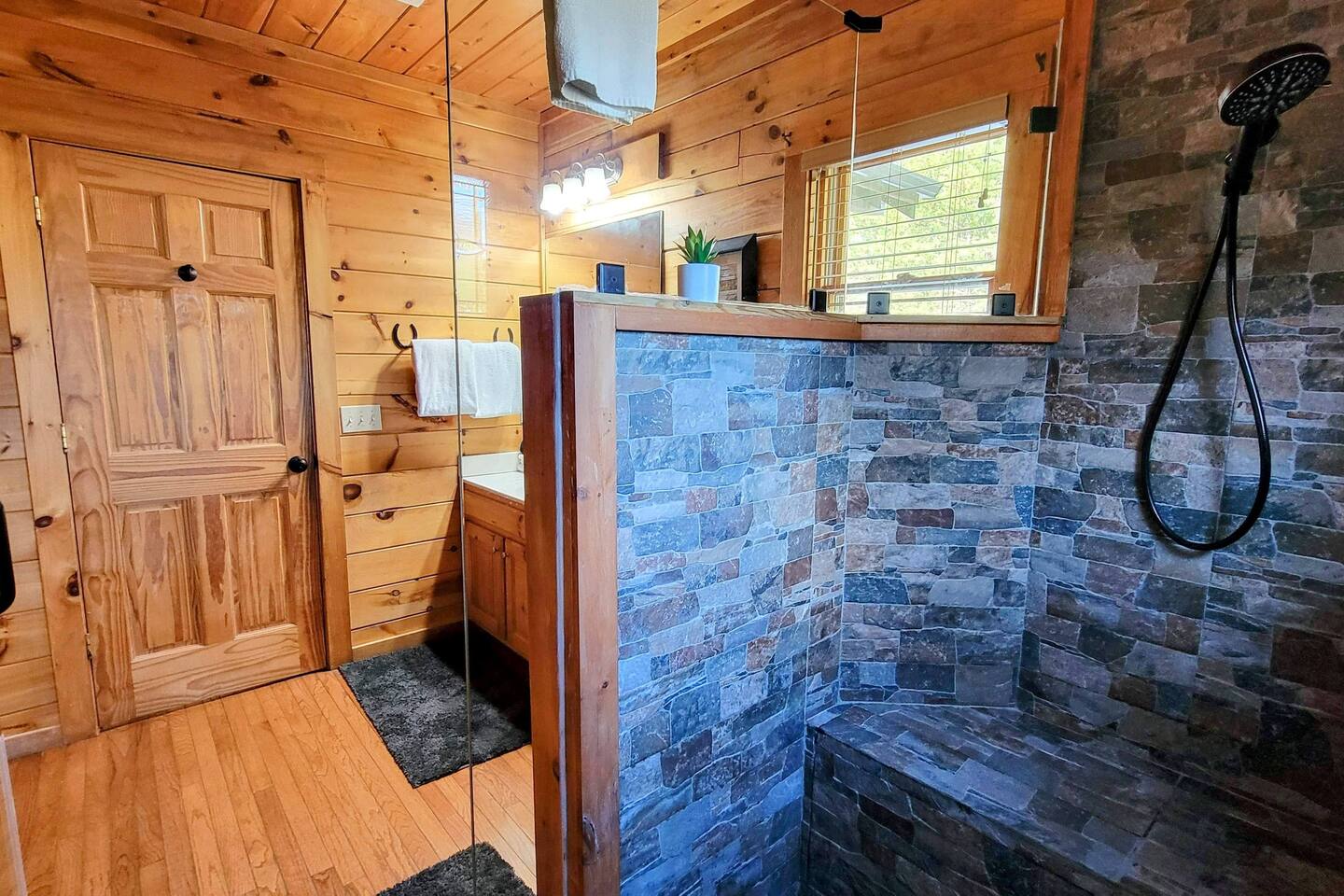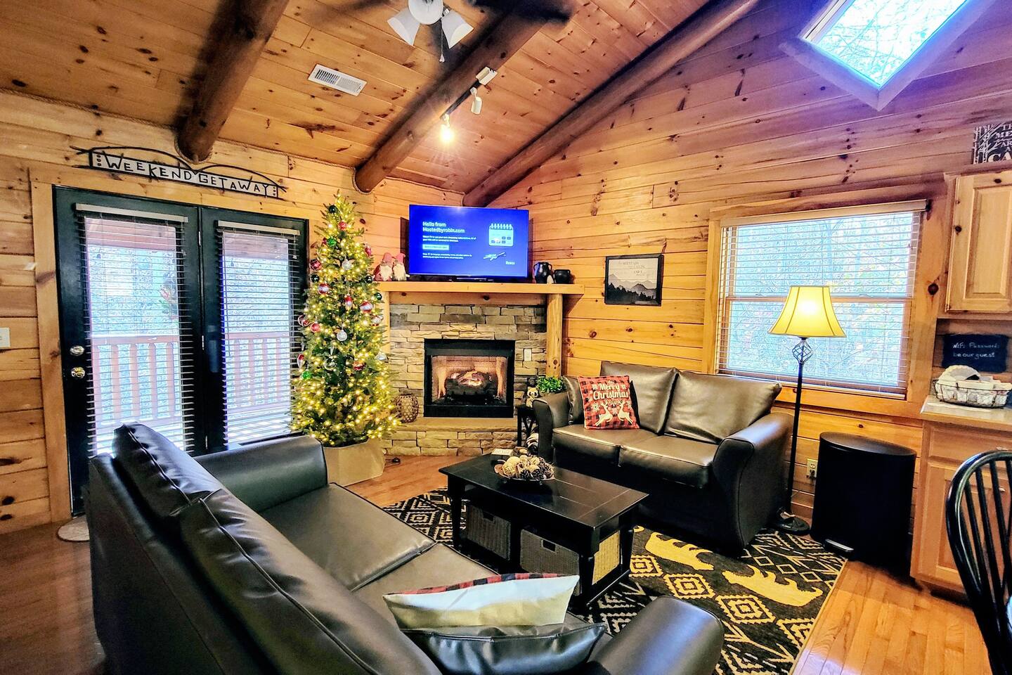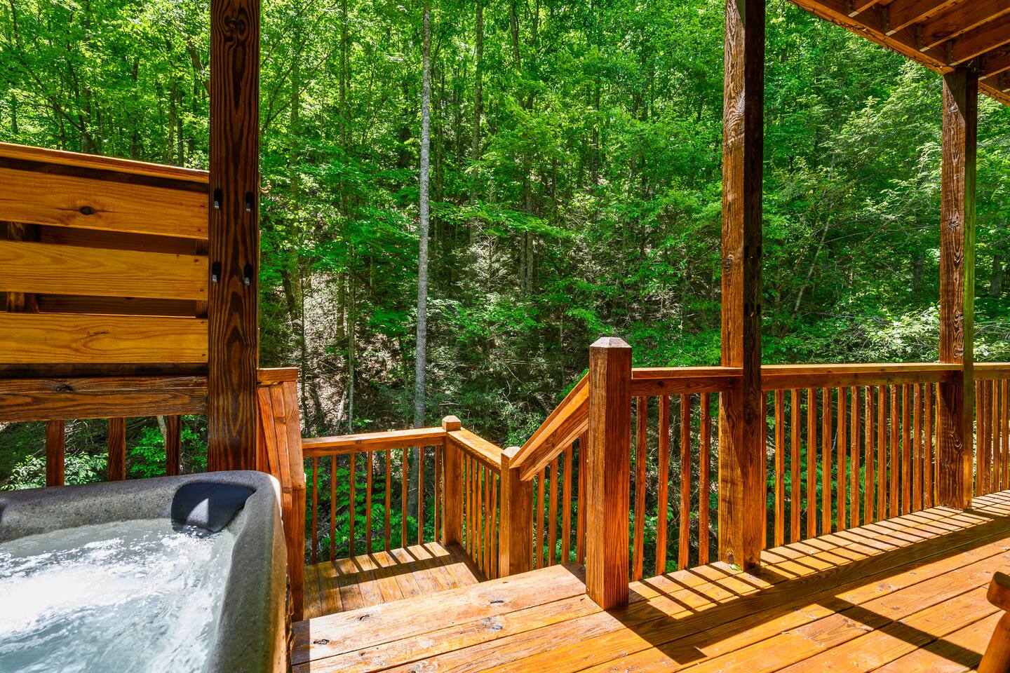 This is the perfect cabin for couples, friends, or smaller families looking to come together and create lasting memories. The cabin is divided between two levels, each floor with a private bedroom with King bed and full bathroom. Check out the photos of the new double walk in shower! Upstairs, besides a King bedroom with direct deck access, you will also find a living room with leather couches, sleeper sofa, large screen smart TV with Roku and DVD player, and a fully equipped kitchen. The gas fireplace, with push button starter, is available Oct-April. Downstairs is another private bedroom with King bed and full bathroom. The rec room is downstairs with a pool table, arcade games, TV, board games and books, and a queen sleeper sofa. The hot tub is right outside on the bottom deck. Both decks offer a beautiful wooded setting to enjoy your morning cup of coffee and your evening glass of wine (or shine). Continue down the back stairs to the yard overlooking the seasonal creek with a wood burning firepit. This is the perfect spot to roast marshmallows and enjoy the clear mountain air. When you are ready to venture out, you will find all Smoky Mountain attractions and amusements are only minutes away. We are in the Wears Valley area, right between the Great Smoky Mountains National Park and Pigeon Forge. Whether you are into hiking, biking, horseback riding, and rafting; or more into Dollywood, mountain coasters, dinner shows, and go carts, fun for all is close at hand! Smoky Turkey is a traditional cabin in the woods. This means you may see different critters including turkeys and bears . We advise you keep doors shut so these critters don't find their way inside. Also always lock your car and bring all food indoors. Be sure all trash always makes its way into the bear proof trash bins. Also, because we are in the woods, Smoky Turkey has spotty cell reception but offers high speed Starlink satellite internet. Simply log on to the wifi for all internet activity. All televisions have DVD players too, with a collection of modern and classic movies. We do not allow pets. We do not allow smoking or vaping inside or on any deck space.