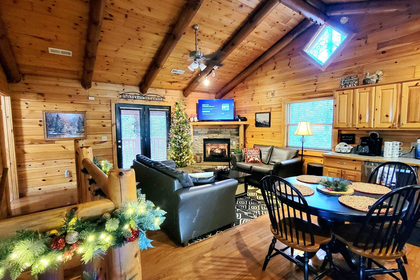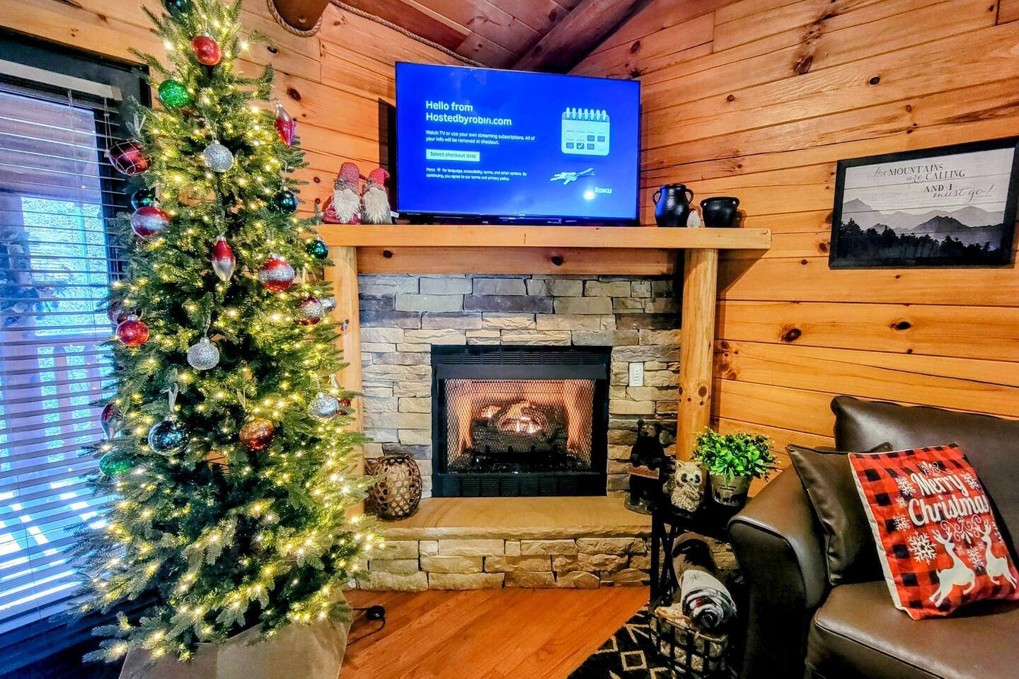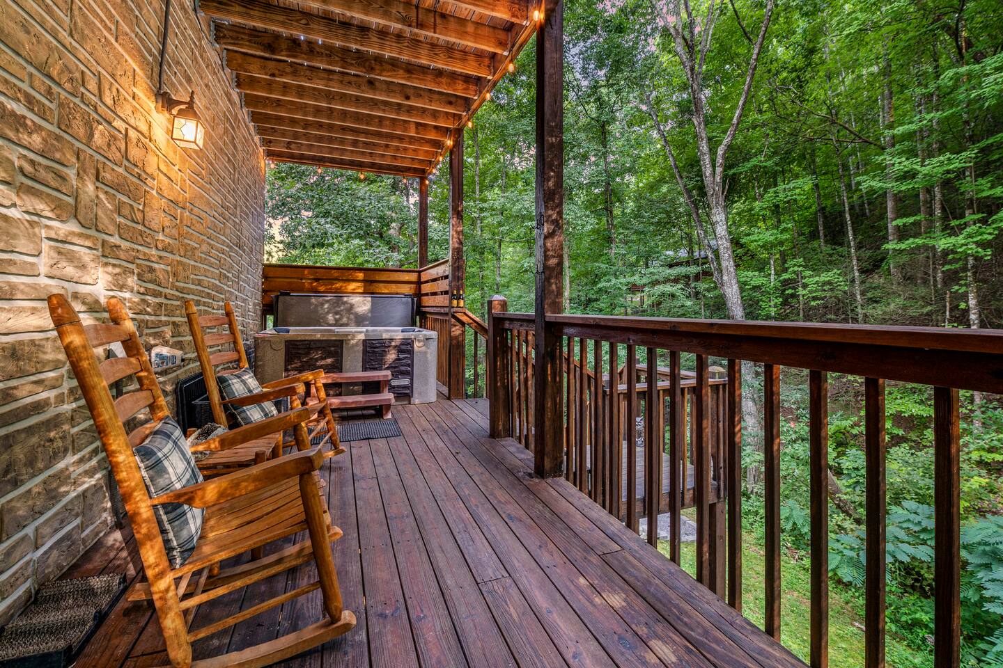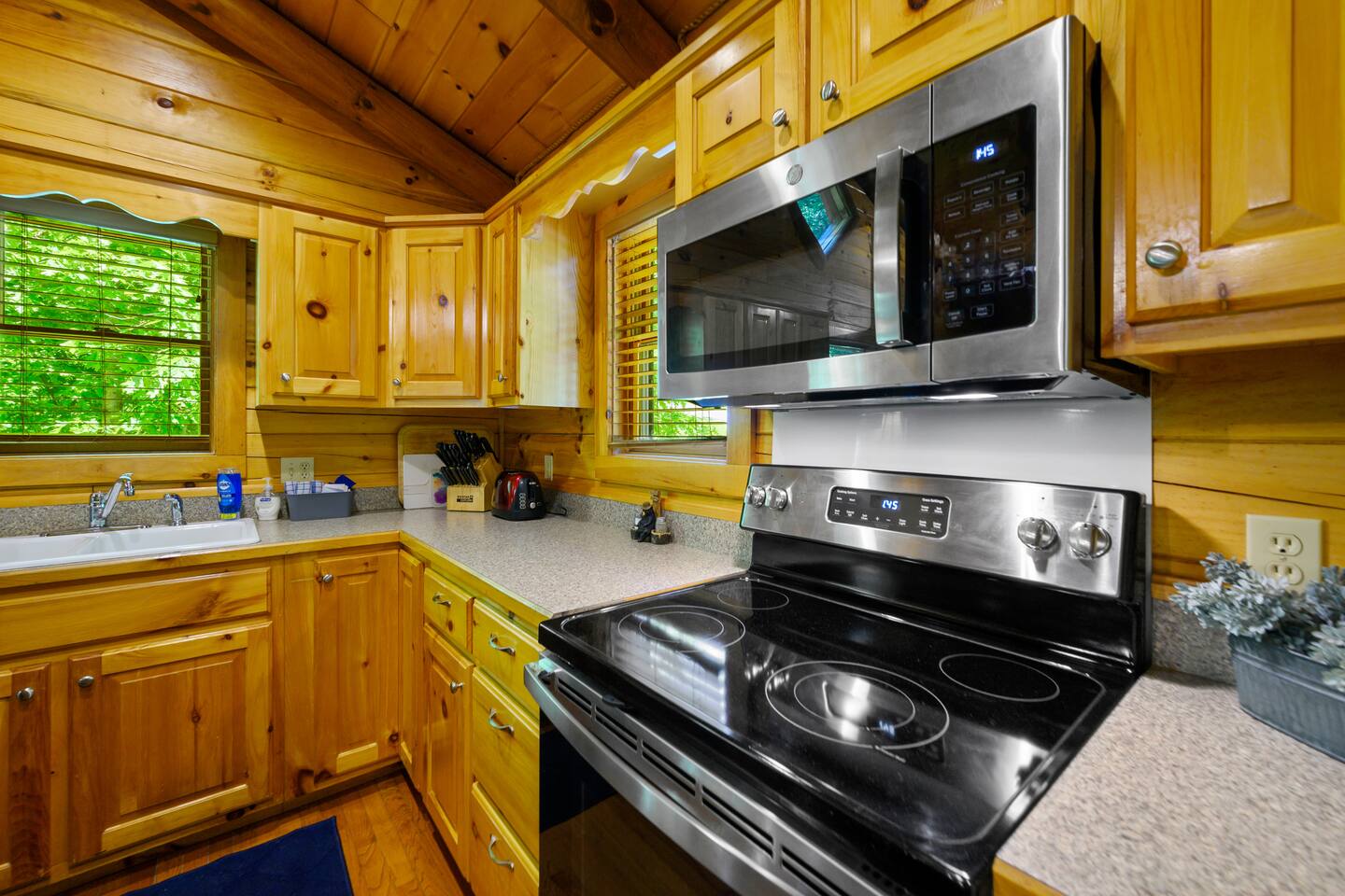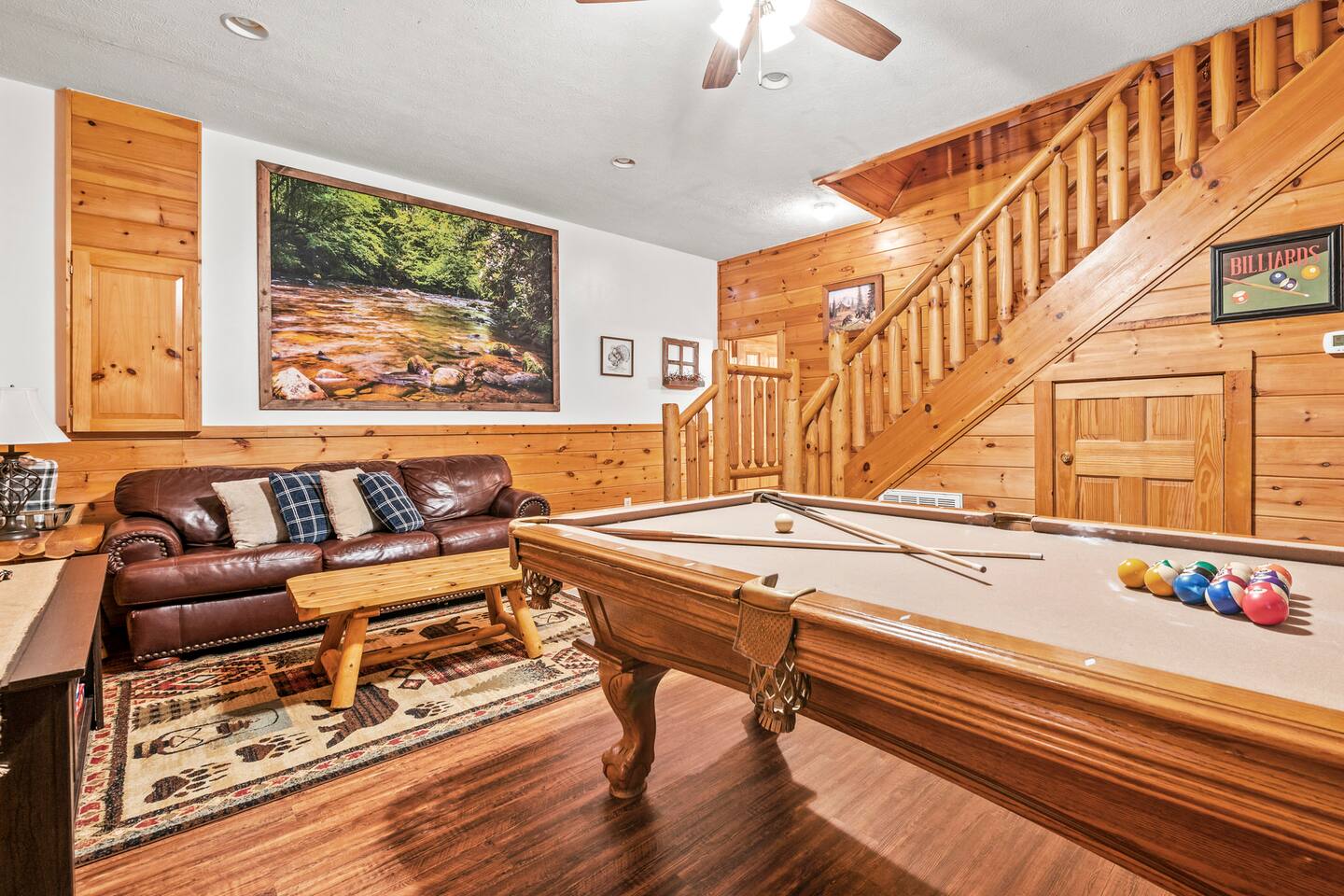 This is the perfect cabin for couples, friends, or smaller families looking to come together and create lasting memories. The cabin is divided between two levels, each floor with a private bedroom with King bed and full bathroom. Check out the photos of the new double walk in shower! Upstairs, besides a King bedroom with direct deck access, you will also find a living room with leather couches, sleeper sofa, large screen smart TV with Roku and DVD player, and a fully equipped kitchen. The gas fireplace, with push button starter, is available Oct-April. Downstairs is another private bedroom with King bed and full bathroom. The rec room is downstairs with a pool table, arcade games, TV, board games and books, and a queen sleeper sofa. The hot tub is right outside on the bottom deck. Both decks offer a beautiful wooded setting to enjoy your morning cup of coffee and your evening glass of wine (or shine). Continue down the back stairs to the yard overlooking the seasonal creek with a wood burning firepit. This is the perfect spot to roast marshmallows and enjoy the clear mountain air. When you are ready to venture out, you will find all Smoky Mountain attractions and amusements are only minutes away. We are in the Wears Valley area, right between the Great Smoky Mountains National Park and Pigeon Forge. Whether you are into hiking, biking, horseback riding, and rafting; or more into Dollywood, mountain coasters, dinner shows, and go carts, fun for all is close at hand! Smoky Turkey is a traditional cabin in the woods. This means you may see different critters including turkeys and bears . We advise you keep doors shut so these critters don't find their way inside. Also always lock your car and bring all food indoors. Be sure all trash always makes its way into the bear proof trash bins. Also, because we are in the woods, Smoky Turkey has spotty cell reception but offers high speed Starlink satellite internet. Simply log on to the wifi for all internet activity. All televisions have DVD players too, with a collection of modern and classic movies. We do not allow pets. We do not allow smoking or vaping inside or on any deck space.