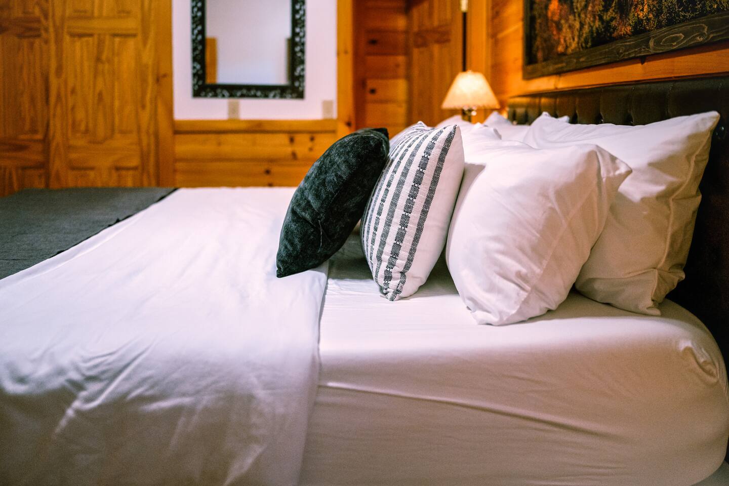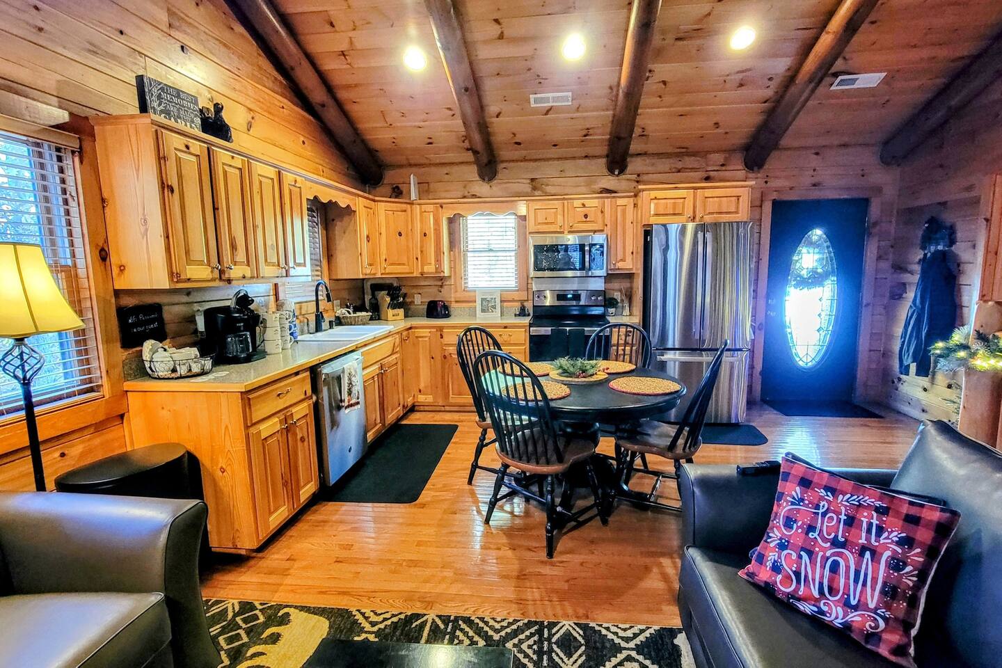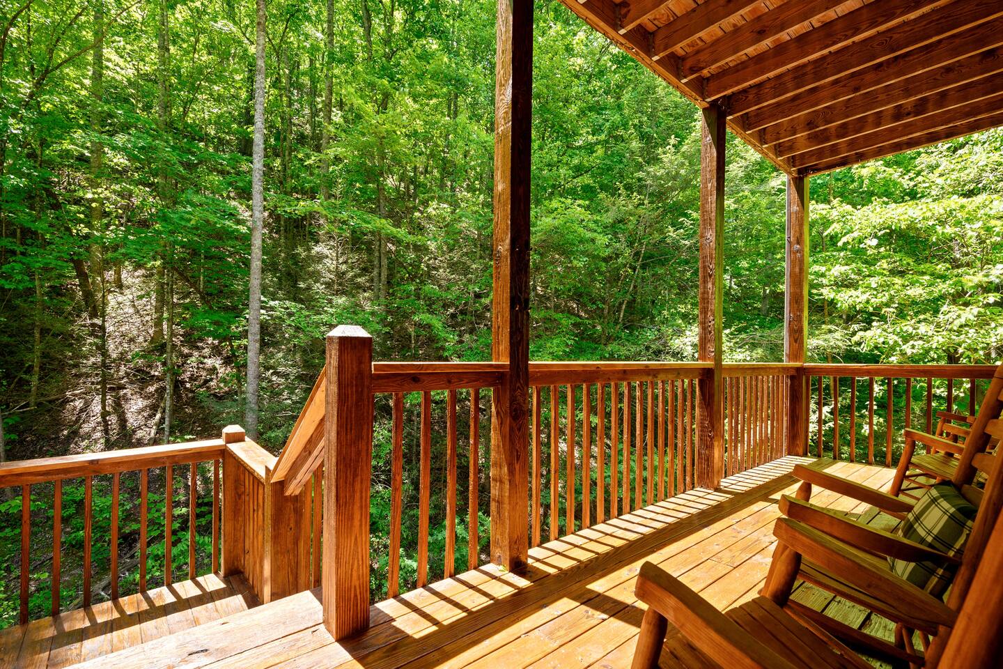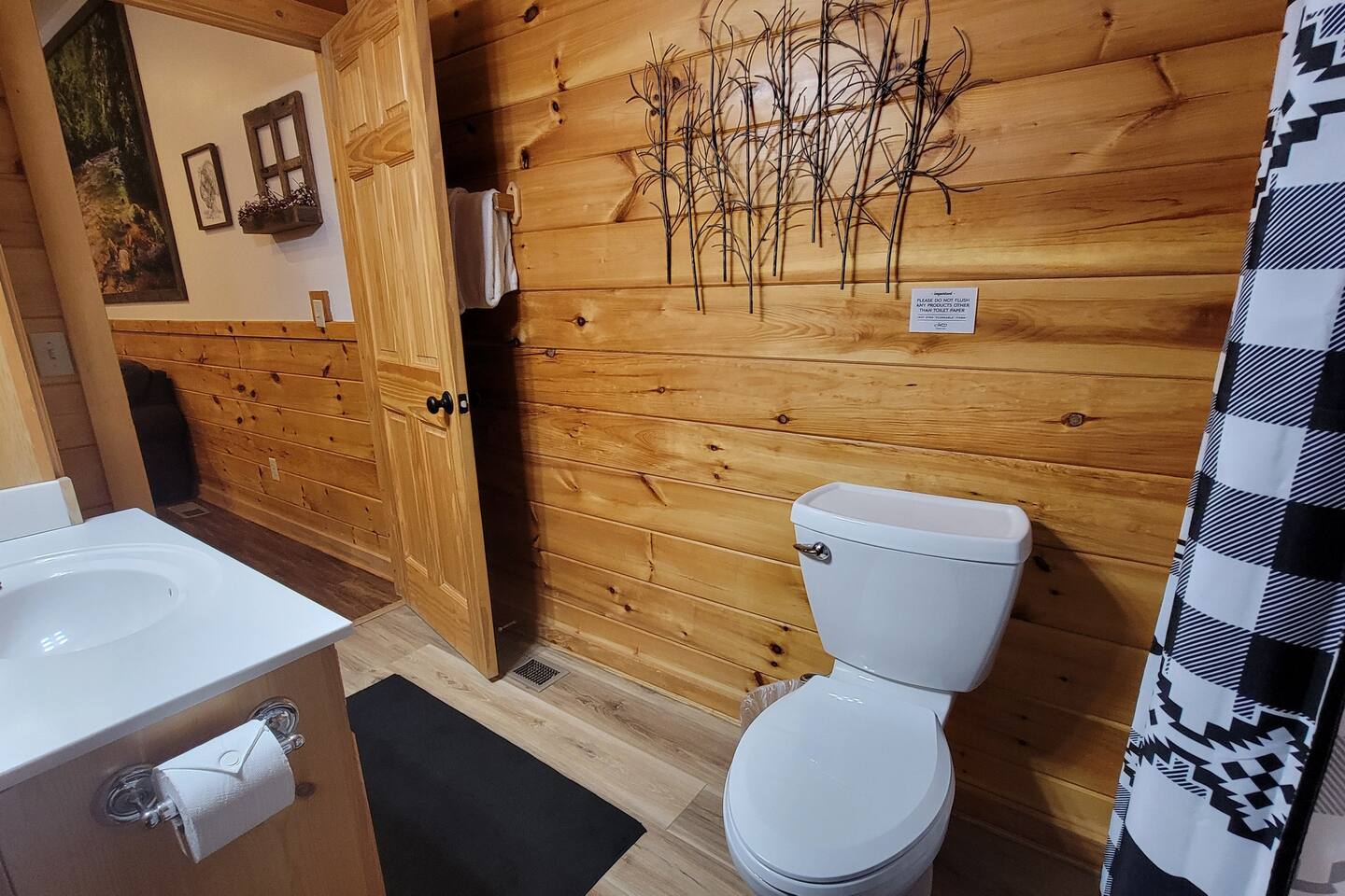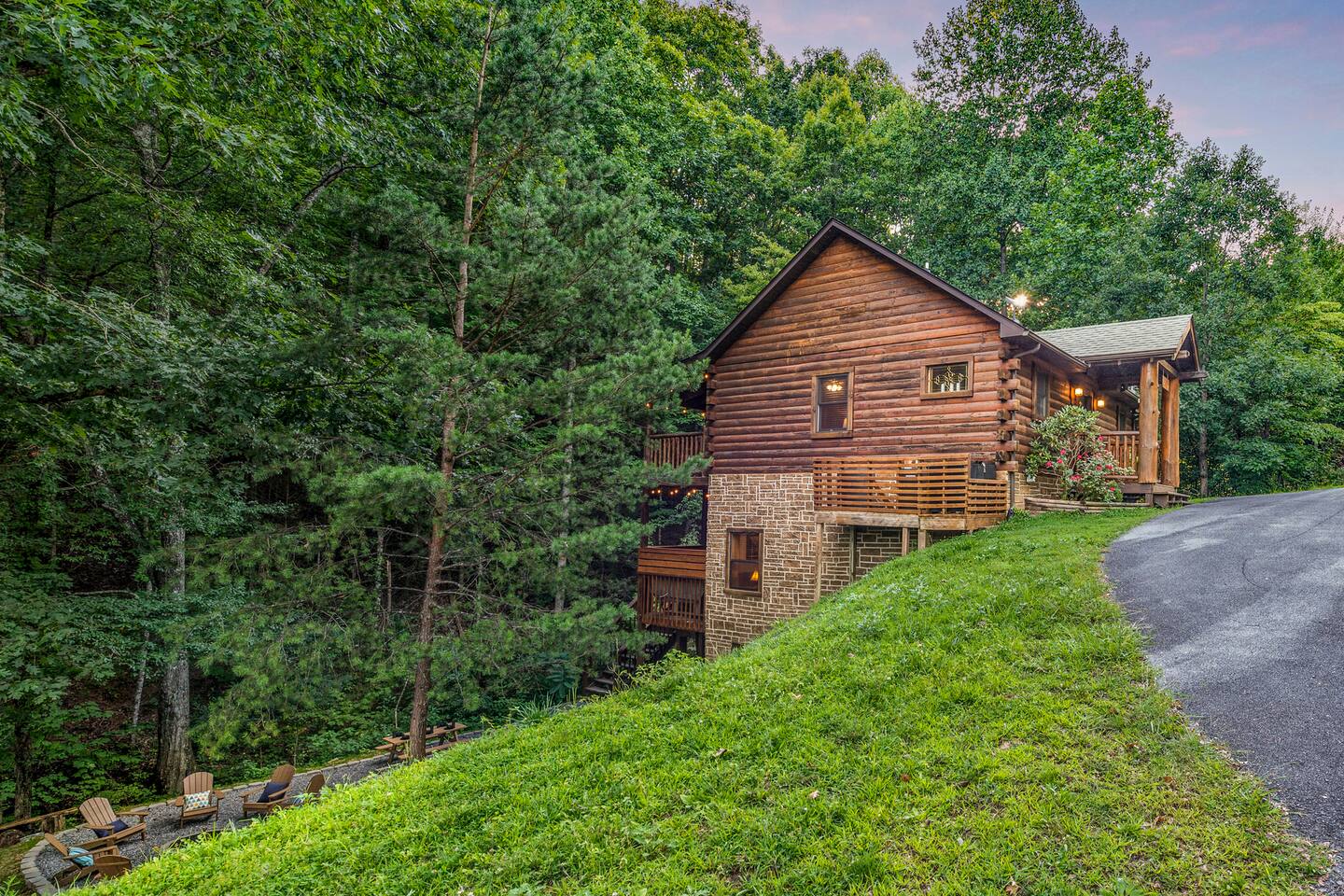 This is the perfect cabin for couples, friends, or smaller families looking to come together and create lasting memories. The cabin is divided between two levels, each floor with a private bedroom with King bed and full bathroom. Check out the photos of the new double walk in shower! Upstairs, besides a King bedroom with direct deck access, you will also find a living room with leather couches, sleeper sofa, large screen smart TV with Roku and DVD player, and a fully equipped kitchen. The gas fireplace, with push button starter, is available Oct-April. Downstairs is another private bedroom with King bed and full bathroom. The rec room is downstairs with a pool table, arcade games, TV, board games and books, and a queen sleeper sofa. The hot tub is right outside on the bottom deck. Both decks offer a beautiful wooded setting to enjoy your morning cup of coffee and your evening glass of wine (or shine). Continue down the back stairs to the yard overlooking the seasonal creek with a wood burning firepit. This is the perfect spot to roast marshmallows and enjoy the clear mountain air. When you are ready to venture out, you will find all Smoky Mountain attractions and amusements are only minutes away. We are in the Wears Valley area, right between the Great Smoky Mountains National Park and Pigeon Forge. Whether you are into hiking, biking, horseback riding, and rafting; or more into Dollywood, mountain coasters, dinner shows, and go carts, fun for all is close at hand! Smoky Turkey is a traditional cabin in the woods. This means you may see different critters including turkeys and bears . We advise you keep doors shut so these critters don't find their way inside. Also always lock your car and bring all food indoors. Be sure all trash always makes its way into the bear proof trash bins. Also, because we are in the woods, Smoky Turkey has spotty cell reception but offers high speed Starlink satellite internet. Simply log on to the wifi for all internet activity. All televisions have DVD players too, with a collection of modern and classic movies. We do not allow pets. We do not allow smoking or vaping inside or on any deck space.